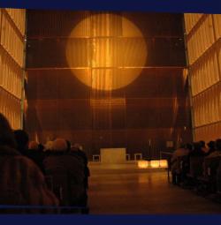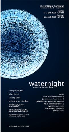 wasserklangbild bei | Die Musik malt Wasserbilder in der Allerheiligen-Hofkirche - Optische und klangliche Höhepunkte Erst sieht es aus wie ein kreisrunder, stiller Teich, in dessen Mitte sich der Vollmond spiegelt. Von ihm aus treiben kleine Wellen nach außen, als habe jemand einen Stein auf das Spiegelbild des Mondes geworfen. Es ist aber weder eine Galaxie, noch sind es Lebewesen, die da auf die Leinwand in der Apsis der Allerheiligen-Hofkirche projiziert wurden. Es ist die Reaktion von Wasser in einer flachen Schale auf die Klangwellen der Musik von Leos Janacek, Sofia Gubaidulina, Eric Whitacre, Peteris Vasks, Wolfram Buchenberg und John Tavener, mit klarer und sicherer Wärme vorgetragen vom Casal Quartett, Julius Berger mit seiner Cello-Klasse und dem Orpheus Chor. "Waternight" heißt das synästhe-tische Konzept. Optische und klangliche Höhepunkte schenkte Sofia Gubaidulinas emotionales Werk "Am Rande des Abgrunds" für sieben Celli und zwei Aquaphone. Süddeutsche Zeitung, 23. April 2008 |